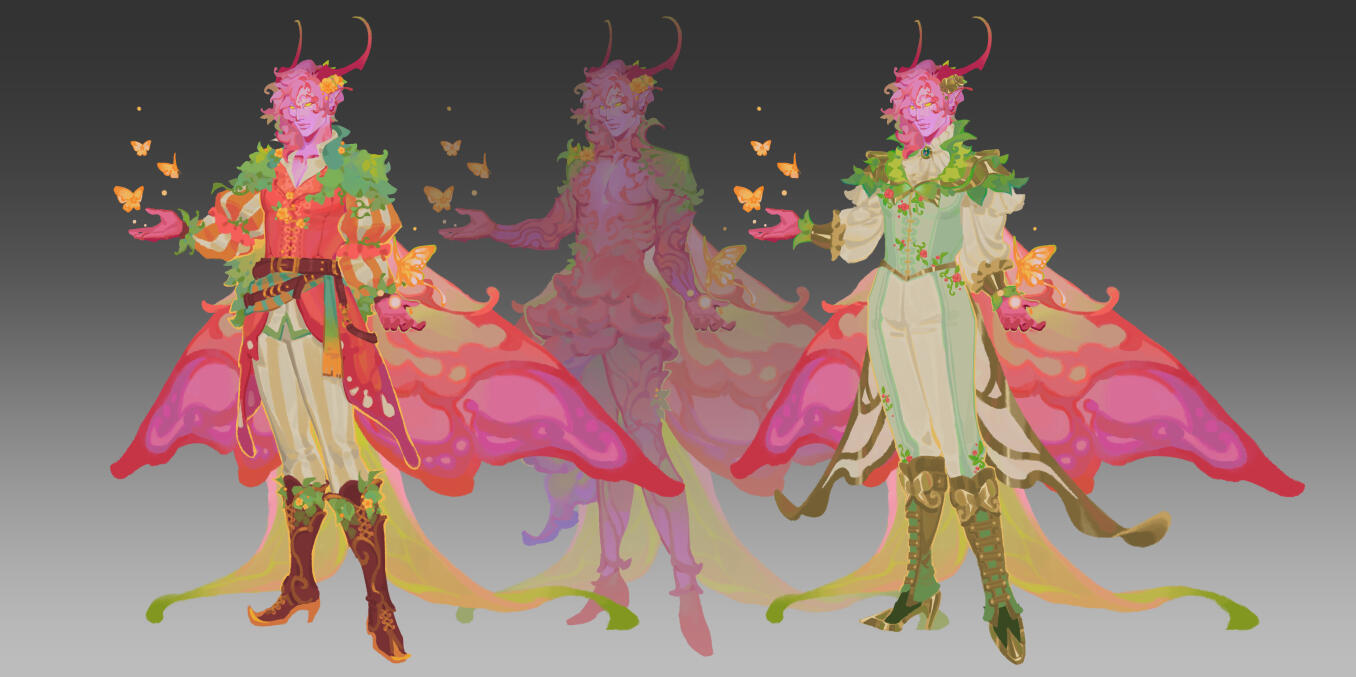 | The Pink Fae [Spring's Muse] was designed from scratch. This option is for if you'd like a new outfit / magical form for your character, or if you'd like me to design something for you from scratch. | This is for the subject of the illustration pre-equipped with a complex outfit or design; a contemporary design will not be charged the same fee as a character from a fantasy setting / a half-monster character for example. This will be discussed & can be negotiated! | I usually paint flat on a solid colour, but if you want a transparent sprite, I will be spending more time on your commission to take that into account. |
